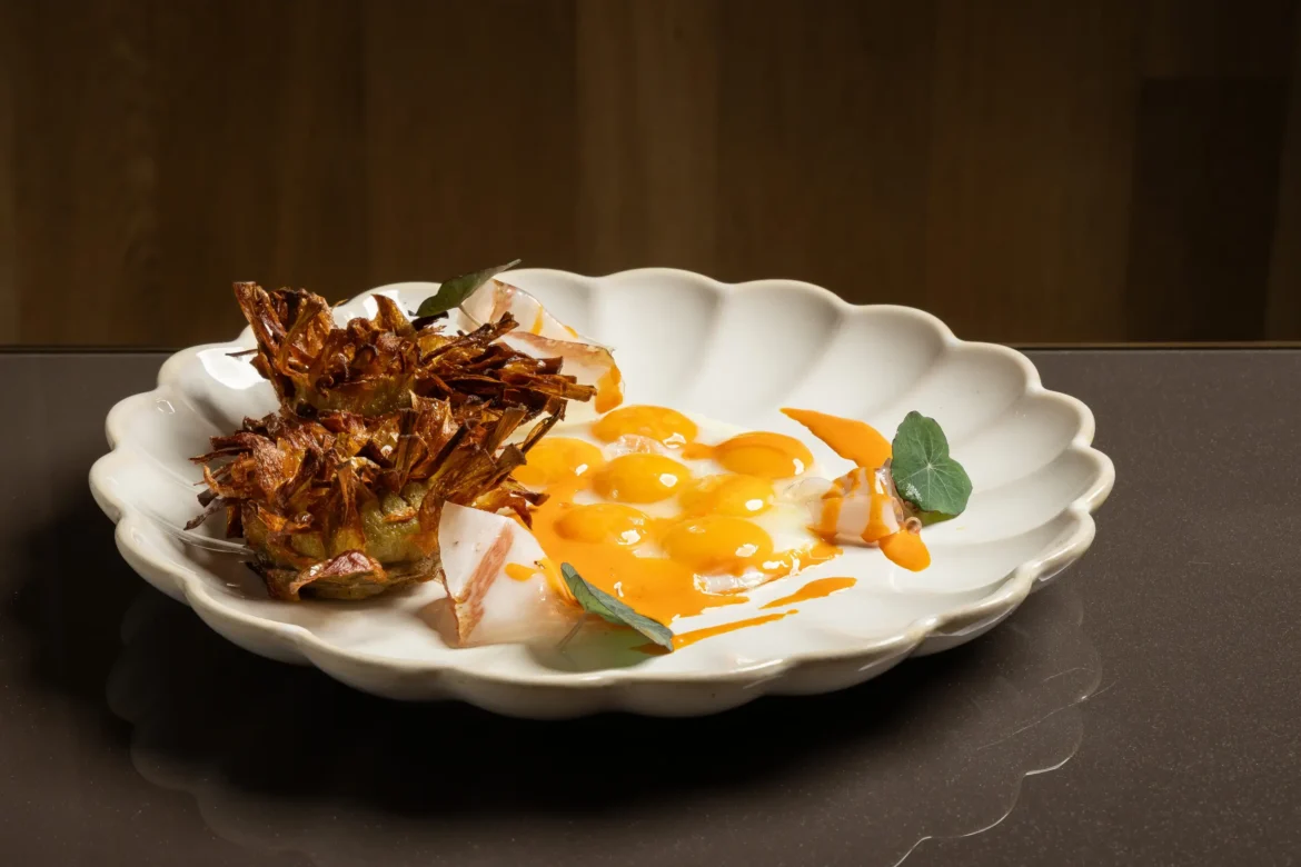 El viaje comienza con una amplia variedad de opciones frescas y vibrantes: entrantes para compartir que reflejan la riqueza de los productos de temporada y marcan la pauta para una experiencia gastronómica cuidadosamente seleccionada. Entre sus especialidades se encuentran la tortilla cremosa de merluza con salsa y judías verdes, los puerros confitados en escabeche de vinagre de Jerez con praliné de anacardos y uvas saladas, y la vieira y lubina con suero de cebolleta, aguacate y galanga. Los platos principales ofrecen algo para todos los gustos, desde reconfortantes sabores cocinados como el Wellington de cerdo ibérico hasta clásicos reinventados, como su pasta de trigo duro con ragú de gambas rojas, servida en una rueda de queso manchego, o el nuevo Big Duck, una hamburguesa de pato con pan de pretzel y una irresistible salsa «Papagena».